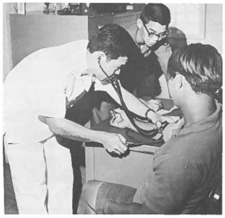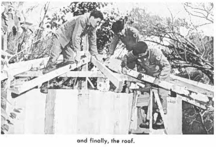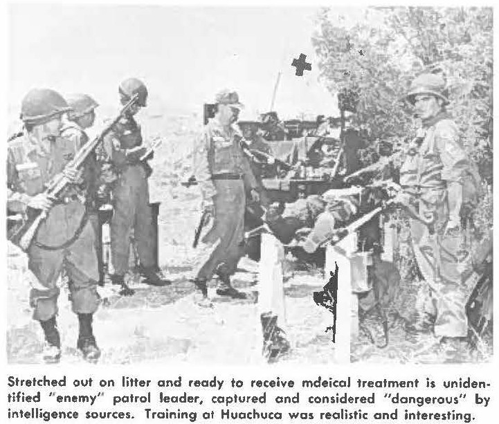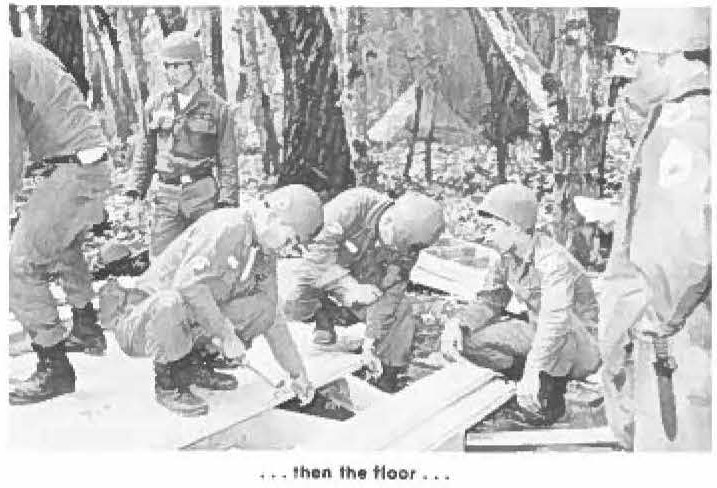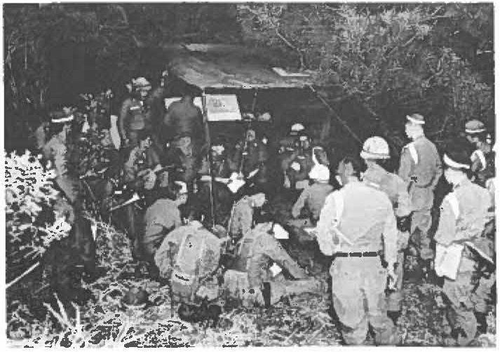 In addition, emphasis was placed on Jungle and Guerrilla Warfare. Excellent instructions were presented by personnel of the 25th Infantry Division in a compact thirty-two hour course involving mountain climbing; rappelling; river crossings by rope bridges and expedient means; jungle crafts, shelters, and food; U.S. Guerrilla and counter-guerrilla operations; communist guerrilla operations; jungle first aid and hygiene; ambush organization, execution, and counter ambush methods; jungle land and compass navigation; jungle tactics; and aerial resupply and evacuation.