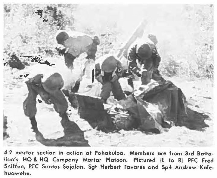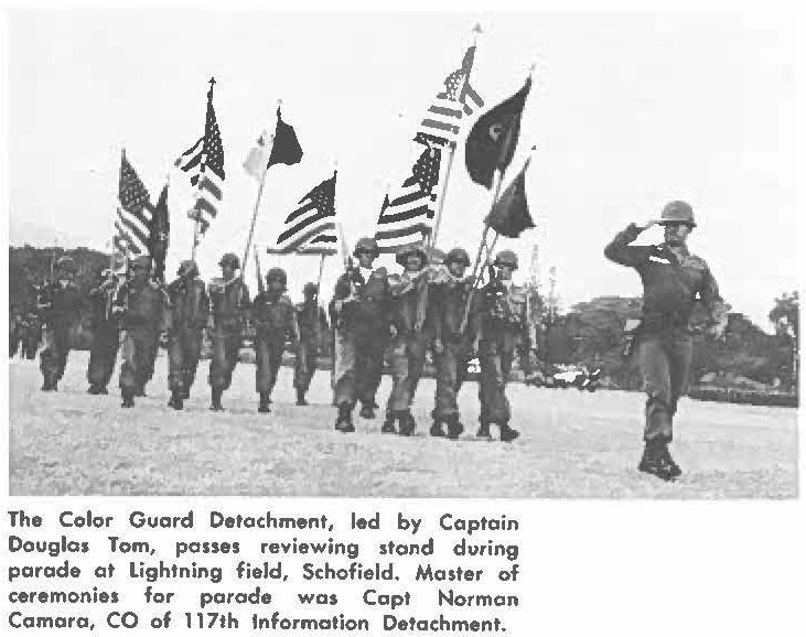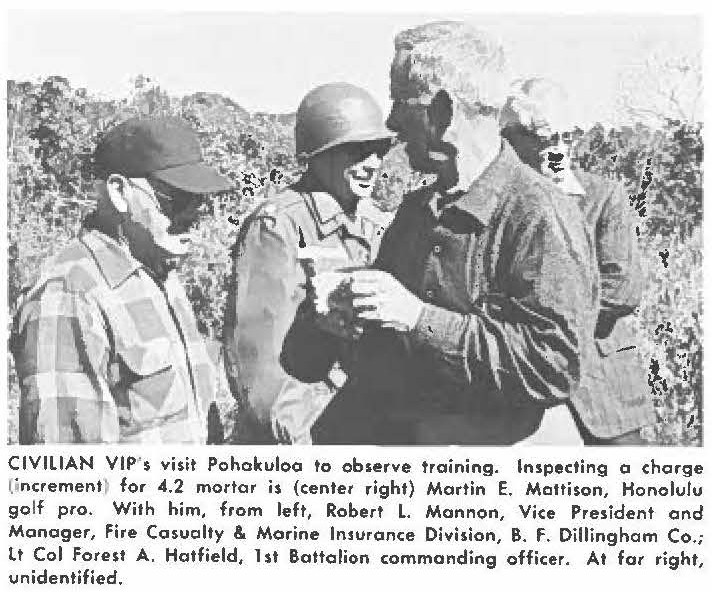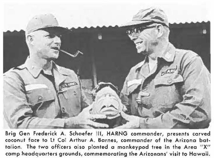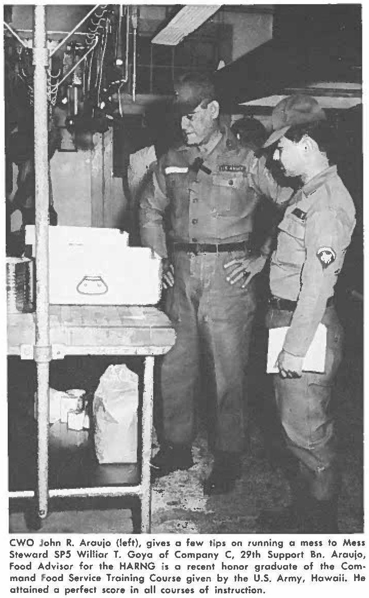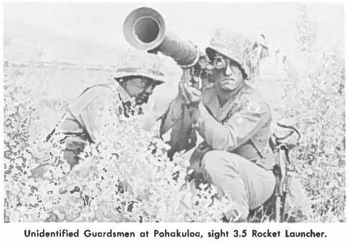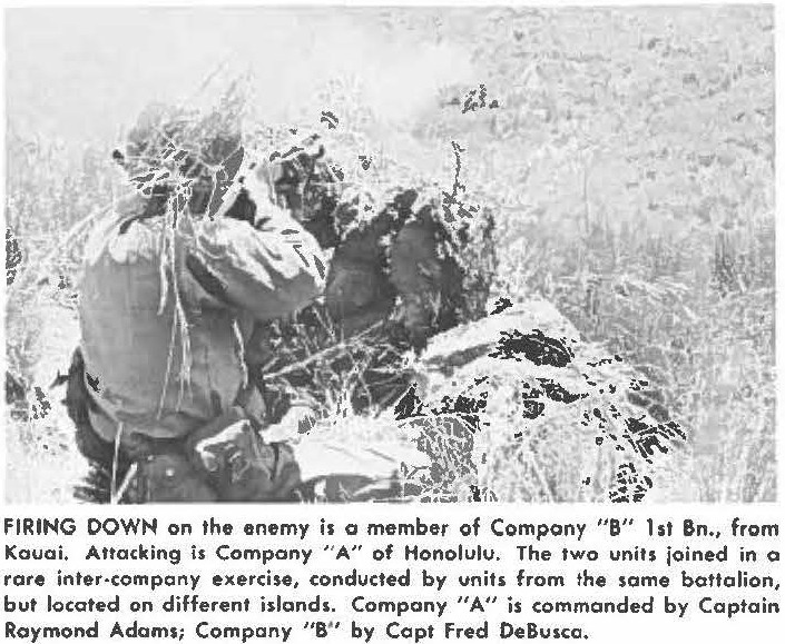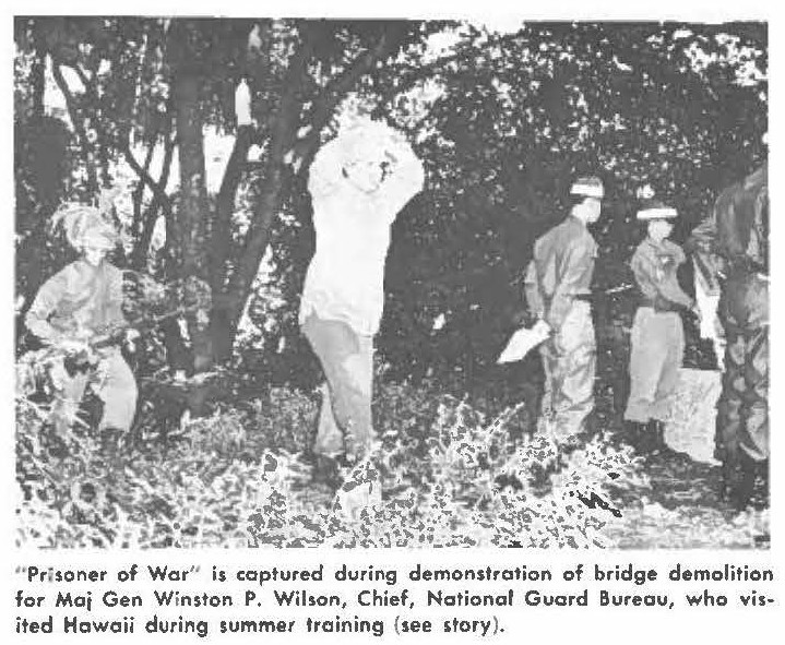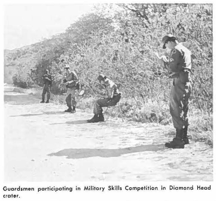 At Schofield Barracks HARNG units will be supporting various activities and at the same time fulfilling their AFT requirements. The 227th Engr Bn will be constrncting the pistol range in Diamond Head crater, constructing a road to a Boy Scout Camp in the Koolaus, and working on other engineer projects together with Regular Army Engineer units. All units except HQ HARNG will participate in the four days and four nights of bivouac during this period.