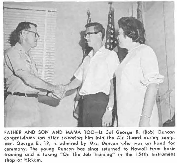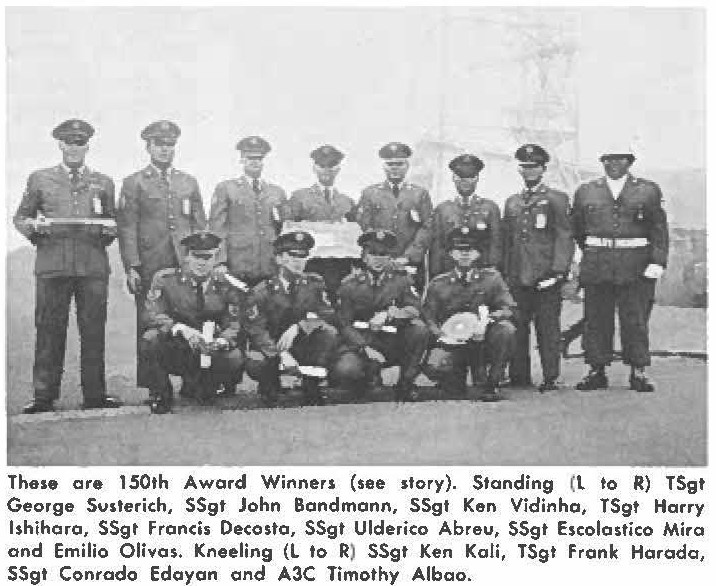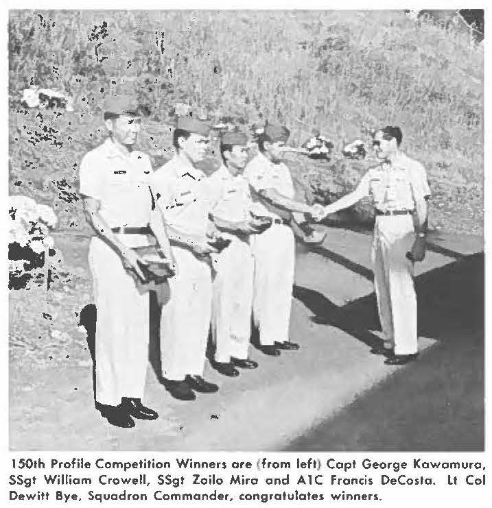 “Exercise High Standard” accelerates its pace . . . more notes handed to each section . . . Col Philip A. Sykes, Commander of the Hawaii Air Defense Division, pays an inspection visit to the Kokee AFS . .. Col Carroll Wight, AFSA, roughs it with the officers of the 150th staying overnight at Locale facilities … Capt Eddie Anderson, PIO, gives an inspirational and entertaining talk to 150th Stargazer reporters … Sections emphasize OJT while not participating in High Standard … Pilots flying out of Bonham X-Training at Kokee AFS.