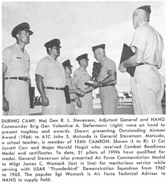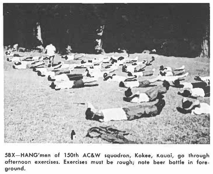 During visit to 150th, Col Philip A. Sykes, Hickam Air Force Base Commander was served by Men Steward SSgt Butch Toguchi. Toguchi has 15 years’ HARNG service and five years’ HANG service. In civilian fife, he is training officer for Kauai Civil Defense. Maj Sterling Tuck, Air force advisor is at far right. Col Corral Wight, Senior AF Advisor who has since departed Hawaii for re-assignment, is seated behind Toguchi. At right is 150th Commander, Lt Col DeWitt Bye. A1C Timothy Albao, Outstanding 1st Year Airman receives award from Maj Gen Robert L. Stevenson, State AG, in ceremonies at 150th site. (see story). 58X- HANG’men of 150th AC&W squadron, Kokee, Kauai, go through afternoon exercises. Exercise must be rough; note beer bottle in foreground. These are 150th Award Winners (see story). Standing (l to R) TSgt George Svsterich, SSgt John Bandmonn, SSgt Ken Vidinha, TSgt Harry Ishihoro, SSgt Francis Oecosto, SSgt Ulderico Abreu, SSgt Escolastico Miro and Emilio Olivas. Kneeling (L to R) SSgt Ken Kali, TSgt Frank Harada, SSgt Conrado Edayan and A3C Timothy Albao. (Pictures from the 1966 September The Hawaii Guardsman)