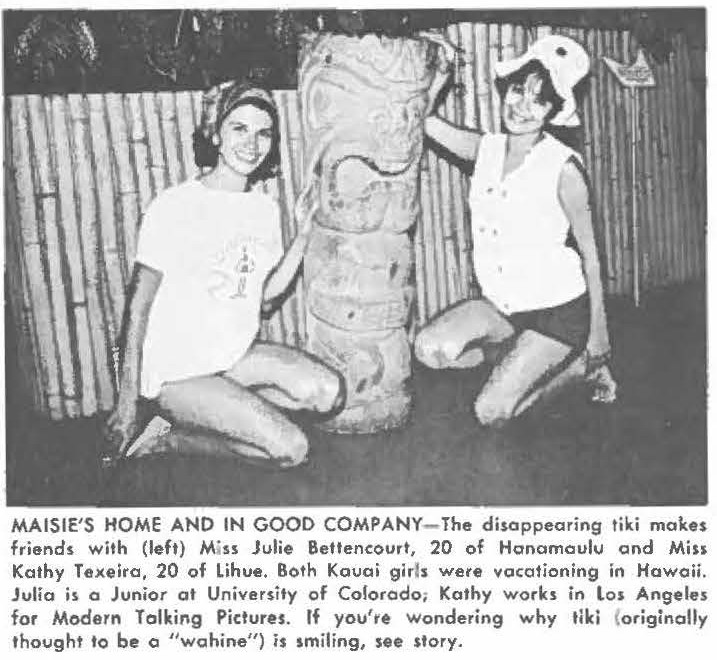 On the humorous side, Kauai residents won’t forget HANG’men for many years. Air Guardsmen “borrowed” a 150-pouncl tiki idol, “Maizie,” from its Koloa home – the Tahiti Long House.