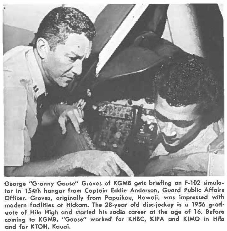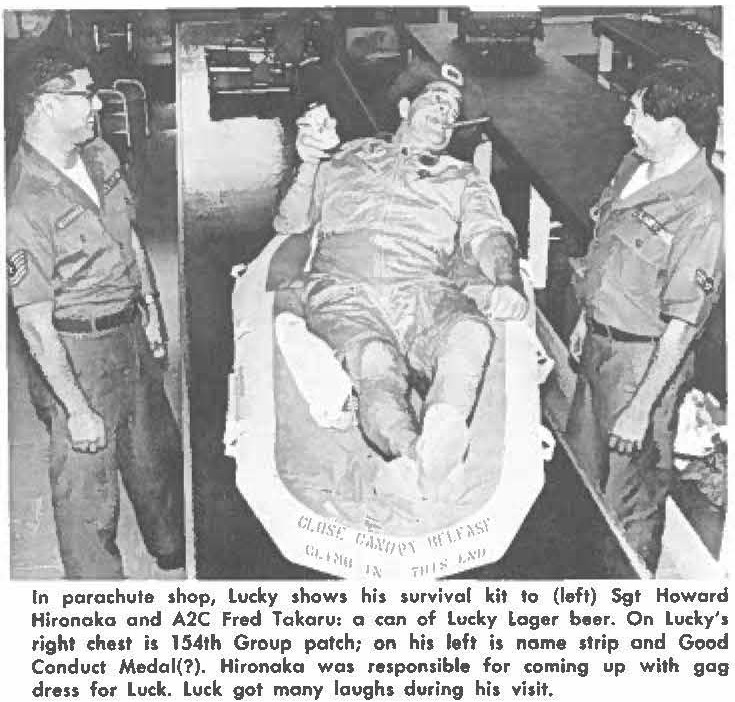 George “Granny Goose” Groves of KGMB gets briefing on F-102 simulator in 154th hangar from Captain Eddie Anderson, Guard Public Affairs Officer. Groves, originally from Papaikou, Hawaii, was impressed with modern facilities at Hickam. The 28-year old disc-jockey is a 1956 graduate of Hilo High and started his radio career at the age of 16. Before coming to KGMB, “Goose” worked for KHBC, KIPA and KIMO in Hilo and for KTOH, Kauai. In parachute shop, lucky shows his survival kit to (left) Sgt Howard Hironaka and A2C Fred Takaru: a can of lucky lager beer. On lucky’s right chest is 154th Group patch; on his left is name strip and Good Conduct Medal(?). Hironaka was responsible for coming up with gag dress for Luck. luck got many laughs during his visit.lucky “broke ’em up” in the Radio Maintenance shop during his visit to the 154th. Hat, with lucky Lager beer can label attached to front, was fabricated by Parachute shop as was flight suit. luck sported three Colonel eagles on each shoulder. On rear of flight suit was sign “LISTEN KOU.” (Pictures from the 1966 September The Hawaii Guardsman)