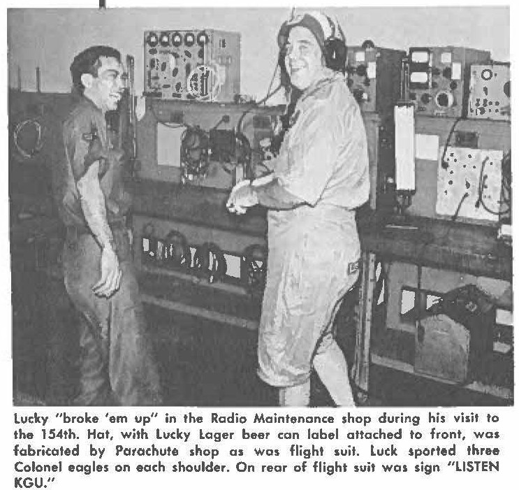 First to visit the 154th Fighter Group at Hickam was Lucky Luck of KGU who was presented with flight suit hemmed at the knees. (Lucky likes Bermuda’s.) Honorary Colonel Luck visited every shop in the 154th to include an “inspection” of the 109th AC&W squadron. As the pictures on these pages indicate, HANG’men enjoyed Lucky’s antics.