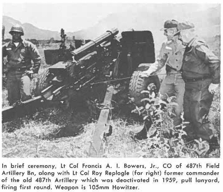 b. The 1st Battalion, 487th Artillery, successfully completed all firing battery tests and conducted a practice battalion level Army Training Test at Pohakuloa Training Area on the Island of Hawaii. This unit has progressed remarkably since its reorganization and conversion in November 1965, from an engineer to an artillery battalion.
