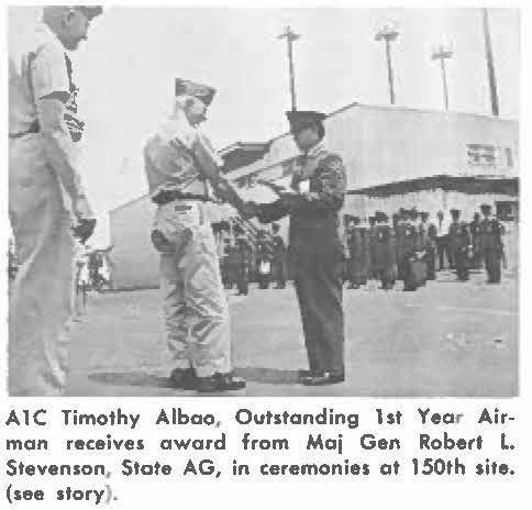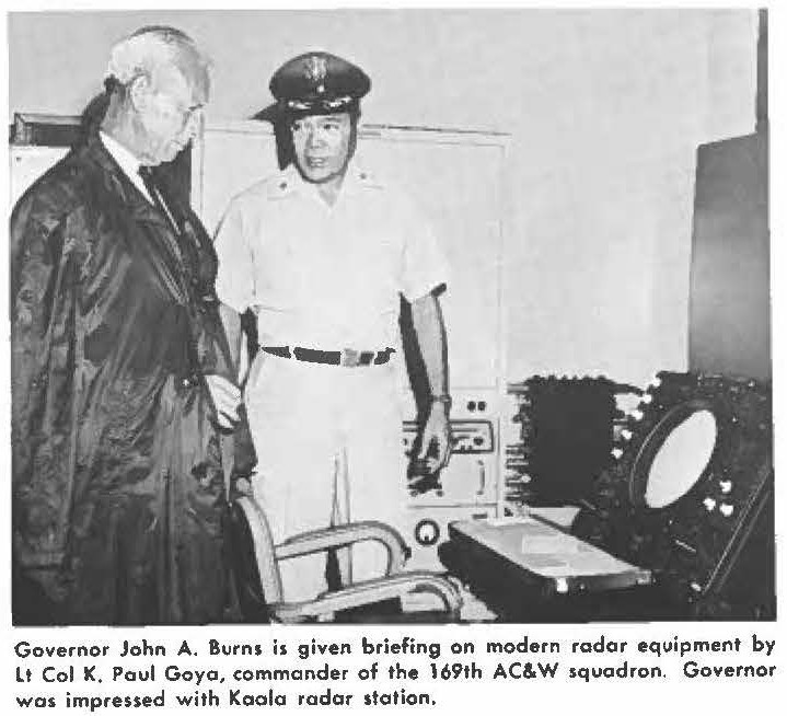 Bright and early Monday morning, squadron personnel put the finishing touches to the squadron area and their dress “Blues” awaiting the inspection of the Adjutant General, Major General Robert L. Stevenson, and HANG Commander, B/ G Valentine A. Siefermann. The General’s party was greeted at planeside by a special Air Police Honor Guard which accorded the Adjutant General full honors. After a quick tour of the Bonham facilities, the VIP group arrived at the Kokee AFS where they were met by a full squadron formation with all personnel in dress Blues. After a few remarks, General Stevenson presented awards to the following members of the squadron: Squadron Outstanding Airman of the Year (Alii Award) to MSgt. Emilio M. Olivas of the Air Police Section ; Squadron Outstanding First Year Airman (Hoku Hou Award) to A3C Timothy L. Albao of the Supply Section; and Squadron Outstanding 4th Quarter Airman (Hoku Award ) to TSgt. George P. Susterich of the Radio Section. Weapons Director’s Qualification Certificates were presented to; Capt Clarenee Jim and Lt John Oshiro. Weapons Technician Qualification Certificates to: TSgts Harry Ishihara and Frank Harada, SSgts John Bandmann, Escolastico Mira, Kenneth Vidinha, Ulderico Abreu, Francis DeCosta, Conrado Edayan, and Kenneth Kali. After lunching with the Squadron Staff, the AG’s group toured the sections and site, then enplaned at Bonham ALF for the flight hack to Oahu and more inspections of Guard units on Oahu.
