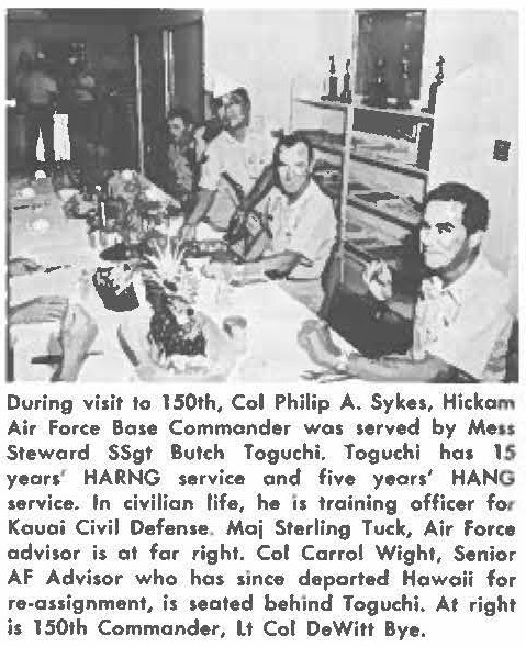 OPERATION BIG SWITCH occurred during the five day June summer camp (there was no Operational Readiness Inspection this year). Fifty HANGmen cross-trained at the Air Guard’s 130th AC&W Sq in Utah; a like number of UTAHmen cross-trained at the 109th, 150th and 169th AC&W Sqs. This worthy effort should really have been called Operation Goya, for it was the “brain child” of Lt Col Kiyoshi P. Goya, Comdr of the 169th.