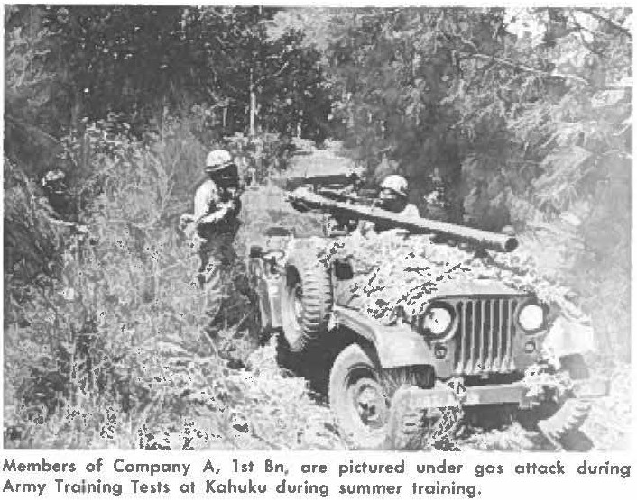At Pohakuloa Training Area, the 29th Inf Bde minus the 2d Bn 299th Inf, will be participating in Company type Army Training Tests. All units to he tested during this summer encampment are at present busily making preparations for the tests. The test involves close teamwork, for it encompasses problems in day and night defense, retrograde movement, and the company in attack.