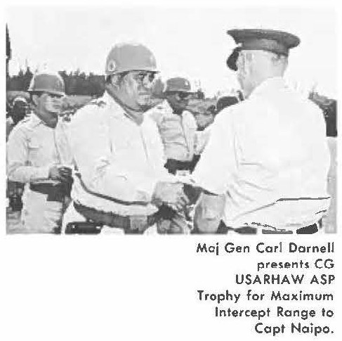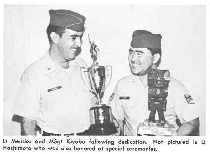 ROCKETRY- SSgt Michael Minakowo, left, Air Guard weapon, technician, has a rapt audience as he explains about rockets and other armaments used on the F-102 jet interceptor. The youngster are Civil Air Patrol cadets from throughout the slate who visited the Air Guard facilities during their annual summer encampment at Hickam.HOLDING THEIR WELL-DESERVED trophies are A2C Kenneth Johnson and MSGT Roy Chee, chosen as the squadron’s Outstanding Airman and NCO, respectively. Lt Col K. Paul Goya, squadron commander, presented the trophies at the end of summer camp. (Pictures from the 1967 Fall The Hawaii Guardsman)
