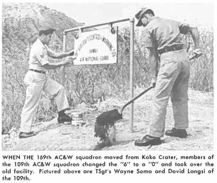 The 169th ACW Sq (F) had two big orders to fill during camp. While maintaining the 24 hour air defense mission at Koko Crater AFS, they had to orient their personnel on the new equipment, operating instructions and join-use radar procedures for the Mount Kaala/Wheeler complex. Big Switch III gave 115 Hawaii and Utah Guardsmen an opportunity to observe a similar mission performed at each other’s stations.