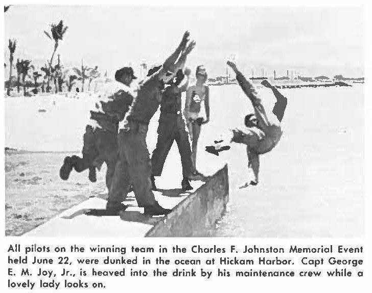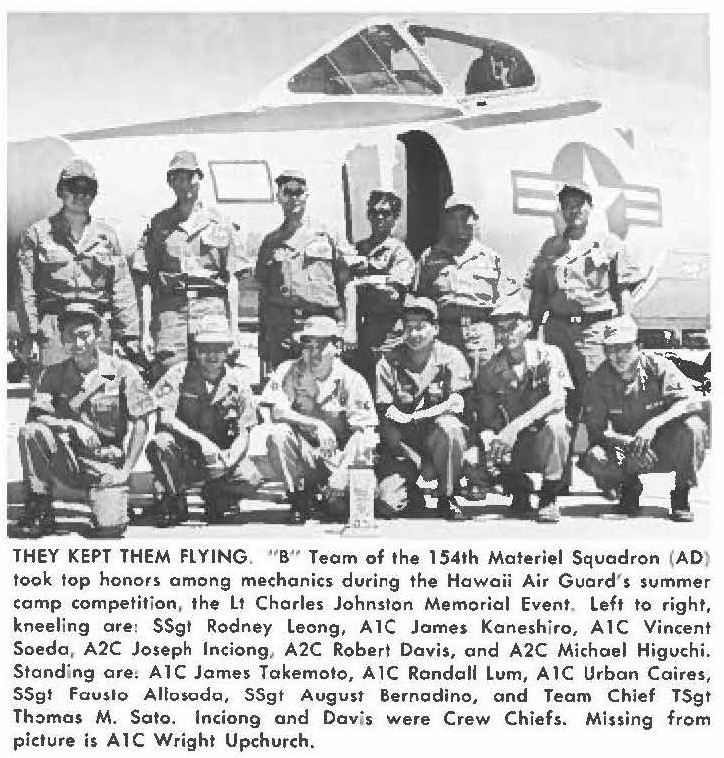 With “another” battle won, squadron personnel celebrated the occasion with a Steak Fry at the Kokee Ranger Camp … special guests of the squadron were 190 members of the 154th group stationed at Bonham ALF … We were honored with the presence of the “Black Berets” from the 199th FIS … Mellowed by the beer and delicious steaks, everyone forgot about the stress and strain of the previous days and everyone enjoyed themselves … lively competition between 154th and 150th entertainers and dancers … Long past the normal “taps,” squadron personnel “stumbled” into their racks …