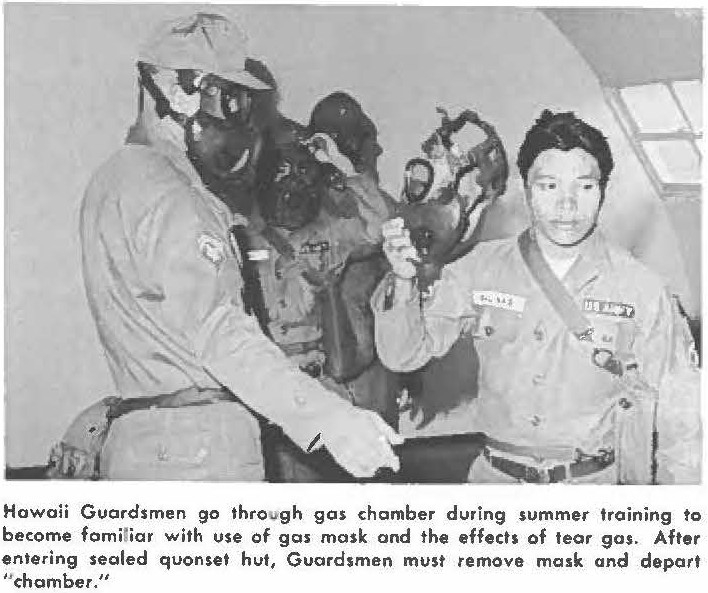 In addition to the primary mission of providing Army Air Defense for the state, personnel received training in riot control, the Ml rifle and a gas chamber exercise where the effectiveness of CS as a riot control agent became a personal experience. Members of the group staff and key unit personnel received extra instruction in the planning aspects of riot control from members of the HARNG staff.
