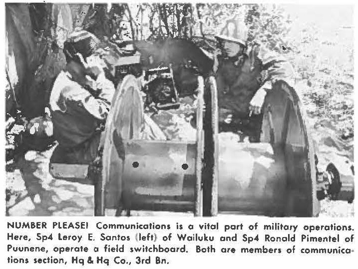 LT COL Paul S. Mori, center right, 201st Mobile Communications Squadron (HANG) commander, accepts an Award of Honor on behalf of the entire unit from BGen Harold R. Johnson, Commander, PAC Comm Area. The award was presented at formal ceremonies recently in recoinition of outstanding 201st support of the Joint SEATO operation “Sea Spirit.” A1C MILTON MORIKONE, left, telephone operator, and A1C Jon Okudara, telephone maintenance technicians, both of the 201st Mobile Comm Sq install a telephone switchboard on location at Sattahip Royal Thai Naval Base, Thailand.SEA SPIRIT(Pictures from the 1969 Fall The Hawaii Guardsman)