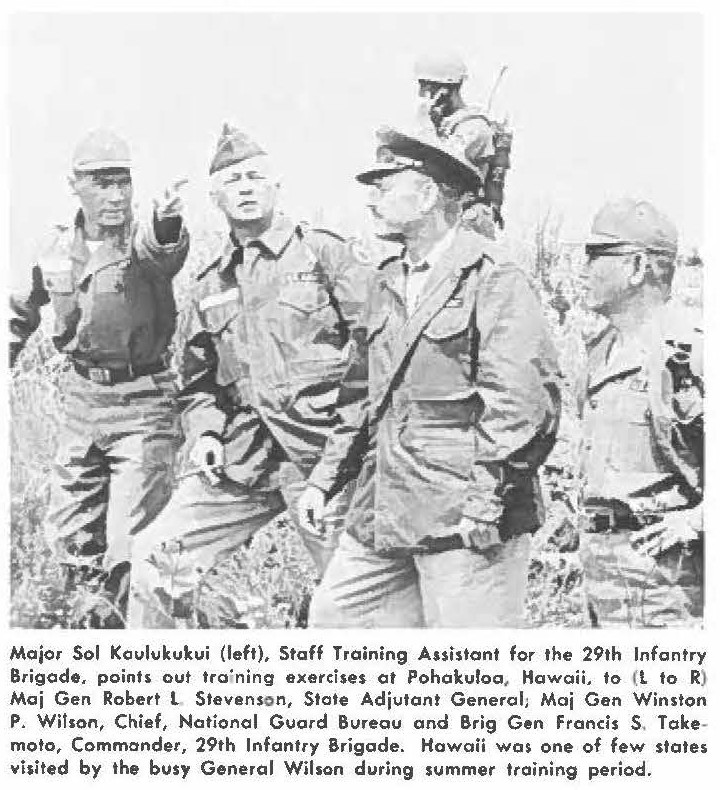 Present plans indicate that the 29th Infantry Brigade (less 1st Bn 487th Arty), HHD HARNG, 111th Army Band, and the 117th Public information Detachment will train at Schofield Barracks and Kahuku training areas during the period 17 June through 1 July. During the same period the 1st Bn 487th Arty is scheduled to train at the Pohakuloa Training Area. The State OCS training will be held during the period 10 June through 24 June at Schofield Barracks.