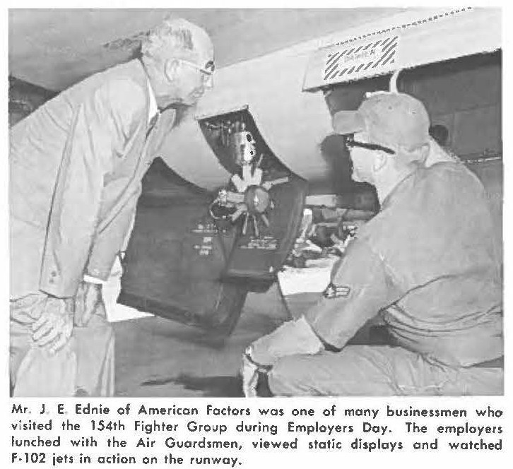 “Operation Broken Arrow” was on hut HANG’men were wide awake. With the exception of the “burning” fighter, Air Guard personnel had completely cleared the ramp of all jet aircraft and ramp equipment within 7 minutes. “In the event of an actual aircraft blaze, fire fighting equipment from Hickam would have responded,” said the satisfied Major Tarbutton.