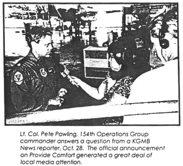 Lt. Col. Pete Pawling, 154th Operations Group commander answers a question from o KGMB News reporter, Oct. 28. The official announcement on Provide Comfort generated a great deal of local media attention. (Picture from the 1994 November Kūkāʻilimoku)