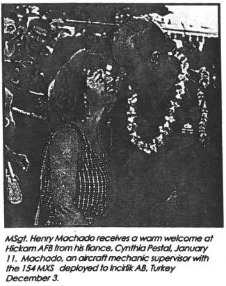 MSgt. Henry Machado receives a warm welcome at Hickam AFB from his fiance, Cynthia Pesfal January 11. Machado, an aicraff mechanic supervisor with the I54 MXS deployed for Incirlik AB, Turkey December3. (Picture from the 1995 February Kūkāʻilimoku)