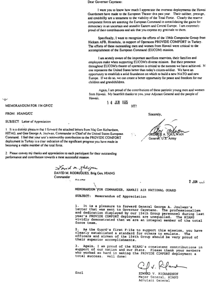 Good luck and best wishes to the airmen of the 154th Group, Hawaii Air National Guard who will be deploying in December to the Iraqi area of operations to participate in Provide Comfort II. They have shown time after time that they are the best in what they do, and I know they will perform in an outstanding manner. We look forward to welcoming them all back in January.