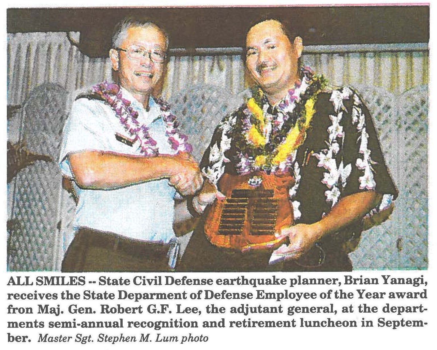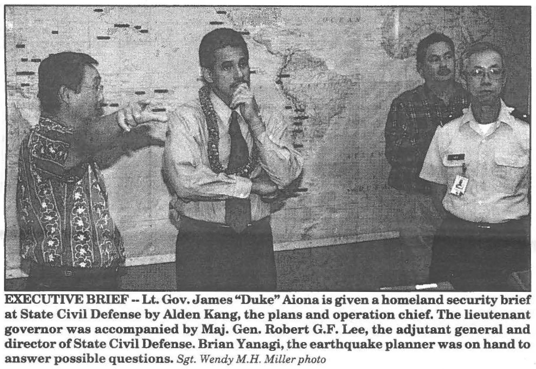 BURNING CONTROL-A Hawaii Army National Guard CH-47D Chinook helicopter fights the fire over Waipio Gentry in June. Ken Ige, Honolulu Star-Bulletin photo“H2O FREEWAY – The temporary bypass road to the North Shore of Oahu was affectionately call the H20 because it was built over water after a rockslide close Kamehameha Highway in March. State Civil Defense photoSHARING IDEAS -Maj. Gen. Edward L. Correa Jr. and Edward T. Teixeira, the director and vice director of State Civil Defense respectively, share Hawaii State disaster plans with the State Partnership Program general offices from the Philippines and Guam at the State Civil Defense’s emergency operating center in Diamond Head Crater. Sgt. 1st Class Wayne T. Iha photoREADINESS TRAINING Hawaii National Guard’s joint emergency operating center was open for business during Exercise MAKANI PAHILI, as well as during the Y2K rollover, Dec. 31, 1999. Sgt. 1st Class Wayne T. Iha photo(Pictures from the 2000 Annual Report)MOTHER NATURE – The State Hazard Mitigation Forum created the Mother Nature campaign to build awareness of Hawaii’s hazard profile and provide lay and technical solutions to reducing the risks. MERCURY RISING. Department of Health workers (below) remove bagged and sealed Mercury contaminates from the Puuwai Momi housing complex in March 2001.PARADISE PROTEST – Honolulu police officers escort marchers, protesting the Asian Development Bank, which held its annual meeting in Honolulu, May 2000. State Civil Defense photo (Pictures from the 2001 Annual Report)State emergency response team (left) participates in a Exercise MAKANI PAHILI workshop. 20 State Civil Defense photosFirst responders sharpen skills during Operation KALAELOA full-scale hazmat exercise at Campbell Industrial Park, May 22.HONOLULU’S FINEST- Police officers are security detailed at the State Emergency Operating Center following the Sept. 11 terrorist strikes.DISASTER PREPAREDNESS – State Civil Defense terrorism exhibit at the disaster expo Feb. 23-24, 2002, Hawaii Convention Center. 18 State Civil Defense photosTABLETOP EXERCISE- scale model city layout was used for a terrorist incident exercise during April’s NASTTPO conference held in Honolulu State Civil Defense photoIN THE LOOP – Vice director Edward T. Teixeira confers with emergency operations staff during state activation for Sept. 11. State Civil Defense photoCENTRAL CONTROL – Control point operations at the state emergency operating center during Exercise MAKANI PAHILI-2002, Hawaii’s annual hurricane exercise.TERROR CONFERENCING – State emergency operations staff on the teleconference bridge for coordination of Hawaii’s response to the terrorist strikes of 9-11. State Civil Defense photos(Pictures from the 2002 Annual Report)ON THE SAME SHEET OF MUSIC – Maj. Gen. Robert G.F. Lee, Hawaii Emergency Preparedness Executive Committee (HEPEC) chair, updates the committee in April , while Edward T. Teixeira addresses the Makani Pahili Hurricane Exercise ‘ Workshop on Disaster Preparedness in May.ON THE SAME SHEET OF MUSIC – Maj. Gen. Robert G.F. Lee, Hawaii Emergency Preparedness Executive Committee (HEPEC) chair, updates the committee in April , while Edward T. Teixeira addresses the Makani Pahili Hurricane Exercise ‘ Workshop on Disaster Preparedness in May ..NEW PLAYERS – New and veteran committee members discuss new ideas and revisit established plans for hurricane preparedness at State Civil Defense. State Civil Defense photos WELCOMING COMMITTEE State Civil Defense staff welcomes the media to the EOC. Sgt. 1st Class Wayne T. Iha photoEOC CENTRAL – Gov. Linda Lingle, joined by Lt. Gov. James “Duke” Aiona (left), briefs the media at the State Civil Defense Emergency Operating Center, during Exercise HO’OPALE ‘ELUA, a terrorism response exercise held in August. Sgt. 1st Class Wayne T. Iha photoEXECUTIVE BRIEF-Lt. Gov. James “Duke” Aiona is given a homeland security brief at State Civil Defense by Alden Kang, plans and operations chief. The lieutenant governor was escorted by Maj. Gen. Robert G.F. Lee, the adjutant general, director of SCD, and homeland security director. Earthquake planner Brum Yanagi was also on hand to answer questions. Sgt. Wendy M. Miller photoPROGRAM MEETINGS – Hazard Mitigation Forum meets at SCD in January. State Civil Defense photo READINESS .. . READINESS .. . READINESS Vice director Edward T. Teixeira (second from left) and his emergency operations staff respond to Tsunami exercise scenarios. State Civil Defense photo(Pictures from the 2003 Annual Report)EXECUTIVE BRIEF – Lt. Gov. James “Duke” Aiona is given a homeland security brief at State Civil Defense by Alden Kang, the plans and operation chief. The lieutenant governor was accompanied by Maj. Gen. Robert G.F. Lee, the adjutant general and director of State Civil Defense. Brian Yanagi, the earthquake planner was on band to answer possible questions. Sgt. Wendy M.H. Miller photo (Picture from the 2003 January – March Pūpūkahi)CHECK-IT-OUT .. Spc. Chester Desiderio stands guard at the front gate. The Hawaii Army National Guard’s 29th Support Battalion soldiers are part of the rapid response forces. ALL SMILES — State Civil Defense earthquake planner, Brian Yanagi, receives the State Department of Defense Employee of the Year award from Maj. Gen. Robert G.F. Lee, the adjutant general, at the departments semi-annual recognition and retirement luncheon in September. Master Sgt. Stephen M. Lum photo CHECK-IT-OUT .. Sgt. Aniutea Tuiolemoto and Spc. Jacquelyn Corderio inspect a motorbike and bag belonging to a photographer covering the Hawaiian Electric Company’s Kahe Point power plant. EOC CENTRAL — SCD staff welcomes the media to the EOC. Sgt. 1st Class Wayne T. Iha photoEOC CENTRAL — Gov. Linda Lingle, joined by Lt. Gov. James “Duke” Aiona, briefs the press at the State Civil Defense Emergency Operating Center. (Pictures from the 2003 July – September