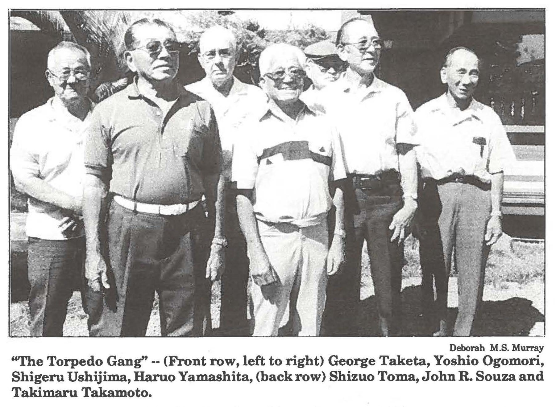 “The Torpedo Gang” — (Front row, left to right) George Taketa, Yoshio Ogomori, Shigeru Ushijima, Haruo Yamashita, (back row) Shizuo Toma, John R. Souza and Takimaru Takamoto. (Pūpūkahi, January – February 1995 photo)