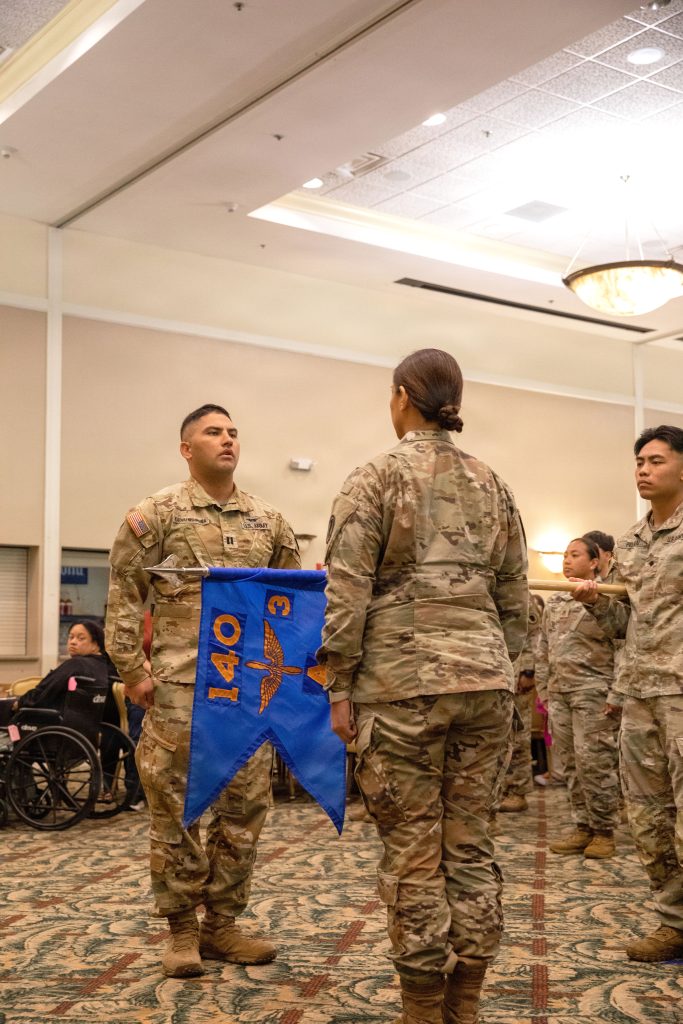 Master Sgt. Clayton Perreira relinquished responsibility of Company B, 2nd Battalion, 211th Aviation Regiment, 103rd Troop Command to 1st Sgt. Kevin Meno during a change of responsibility ceremony in Kalaeloa on Jan. 31, 2026. Distinguished visitors, family, friends and guests attended the event where Meno received the colors from Capt. Zachary Tinao-Rabellizsa, company commander.