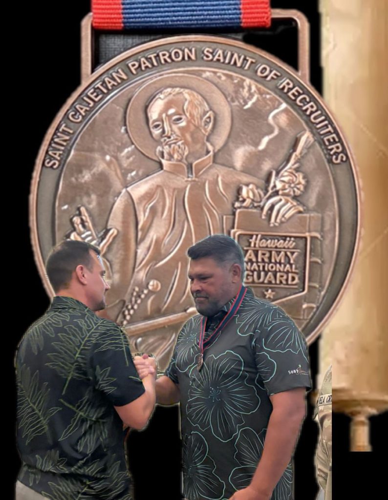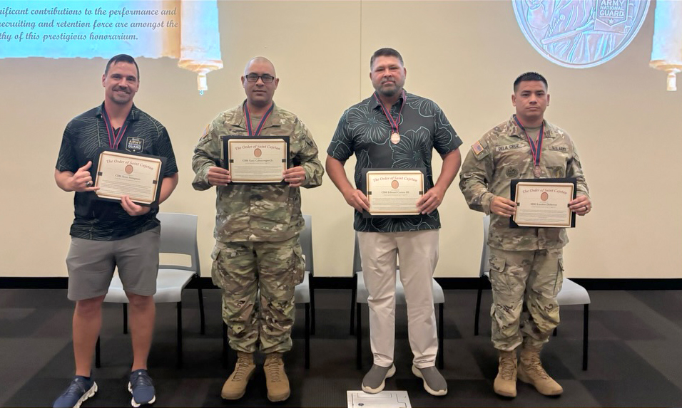 The Hawaiʻi Recruiting Association recently established a new award to recognize recruiting excellence in the Hawaiʻi Army National Guard. The first ever recipients of the award, the Order of Saint Cajetan, are Command Sgt. Maj. Gary Cabacongan, retired Command Sgt. Maj. Scott Stimpson, retired Command Sgt. Maj. Edward Correa and Master Sgt. Landen Dela Cruz.
