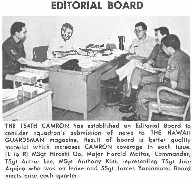 THE 154TH CAMRON has established an Editorial Board to consider squadron’s submission of news to THE HAWAII GUARDSMAN magazine. Result of board is better quality material which increases CAMRON coverage in each issue. (L to R) MSgt Hiroshi Go, Major Harold Mottos, Commander; TSgt Arthur Lee, MSgt Anthony Kim, representing TSgt Jose Aquino who was on leave and SSgt James Yamamoto. Board meets once each quarter. (Picture from the 1966 June The Hawaii Guardsman)TSGT LAWRENCE PARTIKA, fulltimer with the 154th CAMRON Squodron, flies aircraft while standing on the ground. Portika, a 20-year member of the HANG, has been building and flying model aircraft since childhood and is an active member of the Hawaii Radio Control Club. The $800.00 Model pictured above was designed and built by Portiko and took about six months to complete. This is a “full house” model, meaning control surfaces, brakes, throttle and nose wheel steering are activated by radio control. The 37-year-old hobbyist is the father of three children and lives in Kailua. (Pictures from the 1967 March The Hawaii Guardsman)
