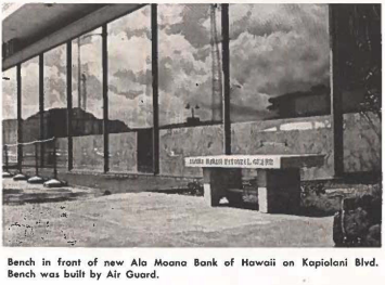 Bench in front of new Ala Moana Bonk of Hawaii on Kapiolani Blvd. Bench was built by Air Guard.(Picture from the 1961 September The Hawaii Guardsman)