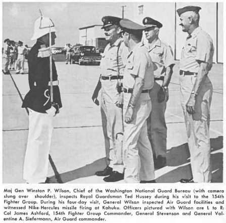 Maj Gen Winston P. Wilson, Chief of the Washington National Guard Bureau (with camera slung over shoulder), inspects Royal Guardsman Ted Hussey during his visit to the 154th Fighter Group. During his four-day visit, General Wilson inspected Air Guard facilities and witnessed Nike Hercules missile firing at Kahuku. Officers pictured with Wilson are L to R: Col James Ashford, 154th Fighter Group Commander, General Stevenson and General Valentine A. Siefermann, Air Guard commander. (Picture from 1964 September The Hawaii Guardsman)