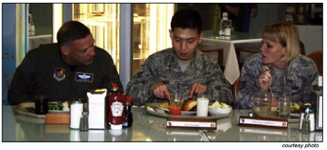(center) Hawaii Air National Guarsman, Senior Airman Tae Han of the 201st Intelligence Squadron, dines with PACAF commander, Gen. Gary North during a luncheon given for the Secretary of the Air Force, Dec. 19, at the NSA/CSS-HI in Kunia. Senior Airman Han was an invited attendee to the SECAF luncheon. The 324th Intelligence Squadron Active Duty associate unit was also in attendance. Staff Sgt. Mary Witherow joins in the conversation with the General. (Pictures from the 2010 January Kūkāʻilimoku)Hawaii Air National Guard Master Sgt. Jermiane Speed, 201st Intelligence Squadron, & Hospitalman Alexandra Stivers, Naval Health Clinic Hawaii, pick up trash along Iliili Road to help prevent flooding in Lualualei Valley. Navy Spec. 2nd Class Mark Logico photo(Pictures from the 2012 Annual Report)