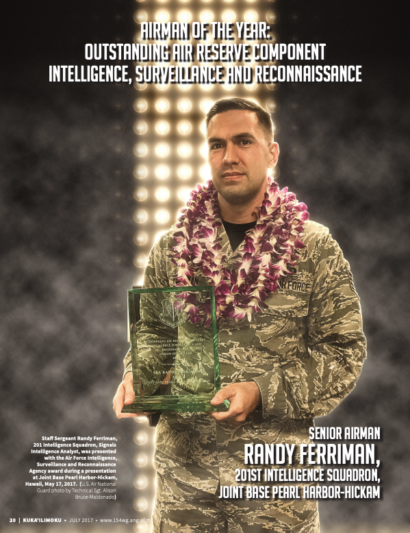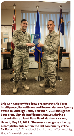 Staff Sergeant Randy Ferriman, 201 Intelligence Squadron, Signals Intelligence Analyst, was presented with the Air Force Intelligence, Surveillance and Reconnaissance Agency award during a presentation at Joint Base Pearl Harbor-Hickam, Hawaii, May 17, 2017. (U.S. Air National Guard photo by Technical Sgt. Alison Bruce-Maldonado)Brig Gen Gregory Woodrow presents the Air Force Intelligence, Surveillance and Reconnaissance Agency award to Staff Sgt Randy Ferriman, 201 Intelligence Squadron, Signals Intelligence Analyst, during a presentation at Joint Base Pearl Harbor-Hickam, Hawaii, May 17, 2017. The award recognizes the top accomplishments within the ISR community of the Air Force. (U.S. Air National Guard photo by Technical Sgt. Alison Bruce-Maldonado)(Pictures for the 2017 July Kuka’ilimoku)
