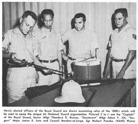 Newly elected officers of the Royal Guard are shown examining relics of the 1800’s which will be used to equip the unique Air National Guard organization. Pidured (l to r) are the “Captain” of the Royal Guard, Senior MSgt Theodore D. Hussey, “lieutenant” MSgt Adam Y. Aki, “Sergent” Major James K. Lota and Council Member at large, Sgt Herbert Panak. (HANG Photo) (Pictures from the 1963 March The Hawaii Guardsman)