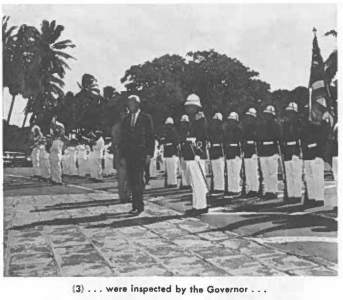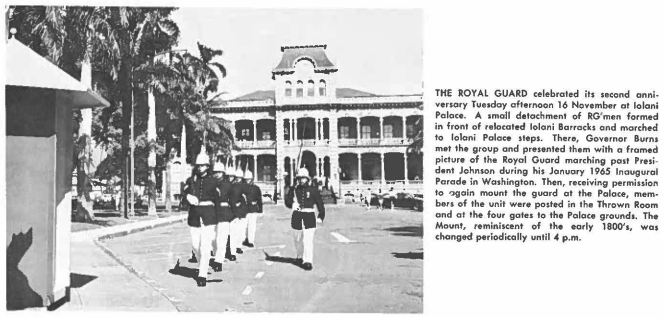 (3) … were inspected by the Governor … (2) … marched to the Palace … (4) and posted guards at the Palace. (Pictures from the 1964 December The Hawaii Guardsman)