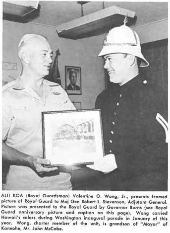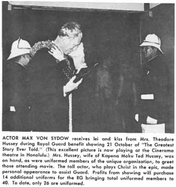 Alli KOA (Royal Guardsman) Valentine O, Wong, Jr., presents framed picture of Royal Guard to Maj Gen Robert l. Stevenson, Adjutant General. Picture was presented lo the Royal Guard by Governor Burns (see Royal Guard anniversary picture and caption on this page), Wang carried Hawaii’s colors during Washington inaugural parade in January of this year. Wong, charter member of the unit, is grandson of “Mayor” of Kaneohe, Mr. John McCabe. ACTOR MAX VON SYDOW receives lei and kiss from Mrs. Theodore Hussey during Royal Guard benefit showing 21 October of “The Greatest Story Ever Told.” This excellent picture is now playing at the Cineroma theatre in Honolulu.) Mrs. Hussey, wife of Kopeno Moku Ted Hussey, was on hand, as were uniformed members of the unique organization, to greet those attending movie. The tall actor, who plays Christ in the epic, made personal appearance to assist Guard. Profits from showing will purchase 14 additional uniform, for the RG bringing total uniformed members to 40. To date, only 26 are uniformed.THE ROYAL GUARD celebrated its second anniversary Tuesday afternoon 16 November at loloni Palace. A small detachment of RG’men formed in front of relocated loloni Barracks and marched to lolani Palace steps. There, Governor Burns met the group and presented them with a framed picture of the Royal Guard marching past President Johnson during his January 196S lnaugural Parade in Washington. Then, receiving permission to gain mount the guard at the Palace, members of the unit were posted in the Thrown Room and at the four gates to the Palace grounds. The Mount, reminiscent of the early 1800’s, was changed periodically until 4 p.m. (Pictures from the 1965 December The Hawaii Guardsman)(Picture from the 1966 Annual Report)DURING HIS 2 JANUARY VISIT TO HAWAII, Vice-P resident Humphrey was greeted with Honor Guard ceremony at Washington Place. Pictured shaking hands with the VP is Royal Guardsman SSql Randall K. H. Lum while Governor Burns looks on. Between VP and Governor (background is MSgt Harry Awana, Jr. Vice-President Humphrey shook hands with all Royal Guardsmen present that evening(Picture from the 1966 March The Hawaii Guardsman)DURING MAY VISIT OF ENGLAND’S Queen Mother, Hawaii Air National Guard Sponsored “Royal Guard” was Honor Guard at Honolulu International Airport. Holding Queen Mother’s hand is Duke Kahanamoku as Mrs. Kahanomoku looks on. Standing next to Queen Mother is Governor Burns. Royal Guard was noticed by “Her Majesty” and as usual “RG” did excellent job. (Picture from the 1966 June The Hawaii Guardsman)OLD GLORY is hauled down at Punamano when station was closed. The now famous Royal Guard was on hand to participate in ceremony. PRESIDENT JOHNSON and Mn, Johnson deplane at Honolulu International Airport an 17 October for overnight stay at the Royal Hawaiian Hotel, on their way to Manila Conference on Vietnam. Air Guard sponsored Royal Guard were Honor Guard. At extreme left of picture os National Guard Lt James Burns, 28-year-old son of Governor Burns (bareheaded, standing in front of Lt Burns) and Mrs. Surns (partially hidden in choir). Since the Royal Guard were formed in January 1963, they have been Honor Guard for England’ s Queen Mother (May 1966) and Vice-President Humphrey (January 19661. They marched in President Johnson’s inaugural parade in Washington January 1965 at the request of the President and have participated in hundreds of community festivities. All Royal Guardsmen participate in “RG” activities on their own time. (Advertiser Photo)(Pictures from the 1966 December The Hawaii Guardsman)ROYAL GUARD ROLLS OUT the red carpet for “Lucky” Luck during a special VIP visit day at the 154th Fighter Group. (Picture from the 1967 Fall The Hawaii Guardsman)