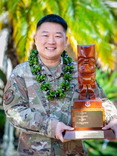 Outstanding HANG Airman Award- AlC Kelly Kim, Jr., 150th Aircraft Control and Warning Squadron, was presented this wooden tiki as the outstanding airman/senior airman who best exemplifies the skills, attitudes and personal attributes necessary for enhancing a successful career as a guardsman. He is also HANG’s nominee for the National Guard Bureau’s (NGB) Outstanding Airman Program.