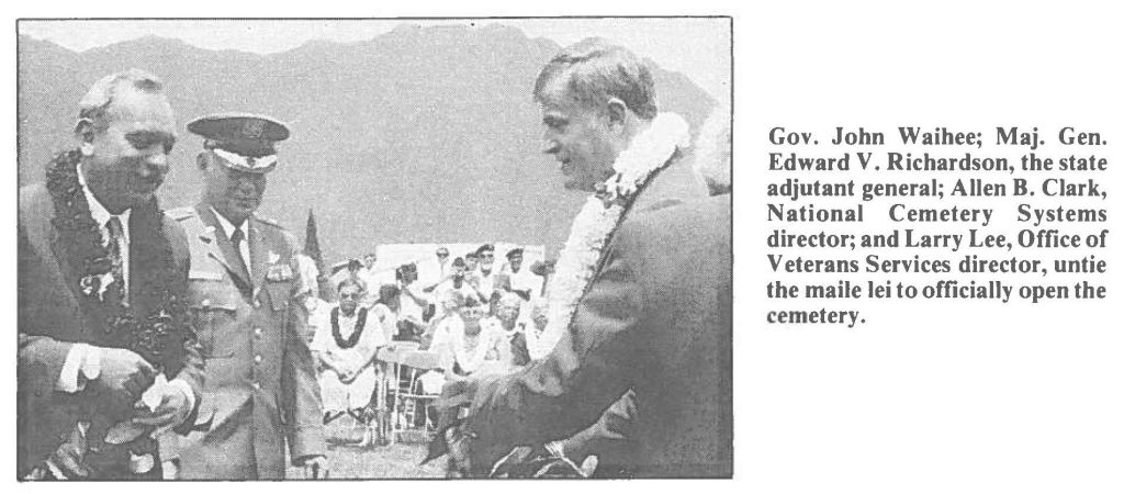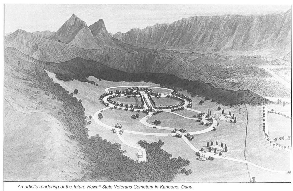 Through Gov. John Waihee’s initiative. the Office of Veterans Services (OVS) was created in 1988 and immediately assigned the responsibility to plan. design, and construct a State Veterans Cemetery on Oahu.