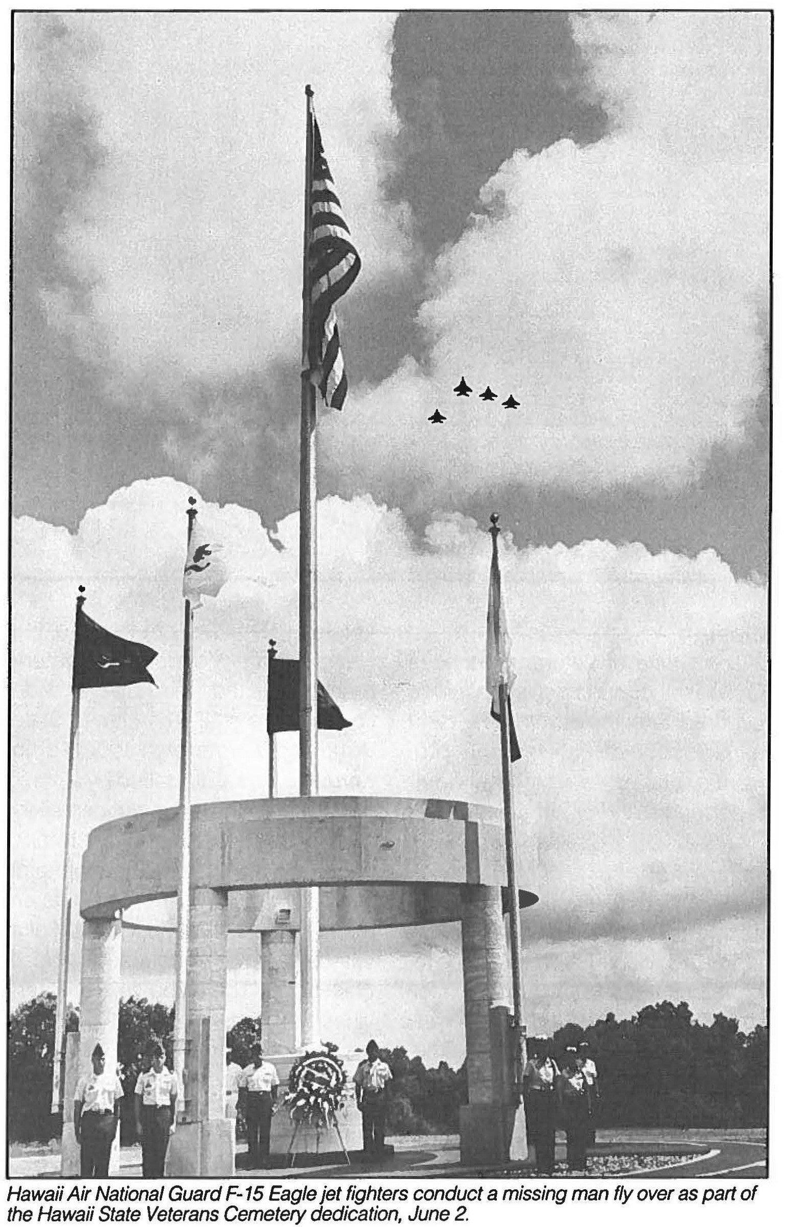 Hawaii Air National Guard F-15 Eagle jet fighters conduct a missing man fly over as part of the Hawaii State Veterans Cemetery dedication, June 2. (Picture from the 1992 Annual Report)