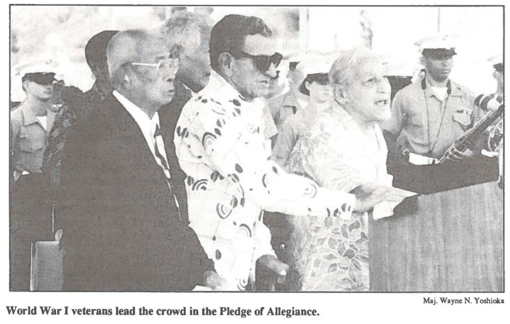 Hawaii Air National Guard F-15 Eagle jet fighters conduct a missing man flyover as part of the Hawaii State Veterans Cemetery dedication ceremony, June 2. (more photos on pages4-5) A joint service color guard renders honors to the American flag during the playing of the national anthem. The Hawaii National Guard’s ceremonial Royal Guard raise the Hawaii State flag in front of the Hawaii State Veterans Cemetery administration building Gov. John Waihee pauses in silent reflection after placing a wreath at the flag plazaSgt. 1st Class Kurtis T. Mabe reviews a guest seating chart. Mabe reviews a guest seating chart. Mabe was among the many Hawaii National Guard members assisting with the dedication ceremony. Veterans cemetery dedicated pages 4-5 A Marine Corps trumpet player plays Taps as a rifle squad from Kaneohe Marine Corps Air Station awaits the signal for the 21-gun salute. World War I veterans lead the crowd in the Pledge of Allegiance. (Pictures from the 1992 July – August Pūpūkahi)