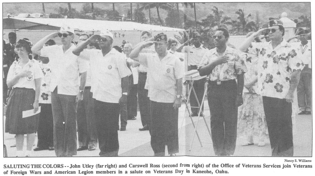 SALUTING THE COLORS – -John Utley (far right) and Carswell Ross (second from right) of the Office of Veterans Services join Veterans of Foreign Wars and American Legion members in a salute on Veterans Day Kaneohe, Oahu. (Picture from the 1992 October – November Pūpūkahi)