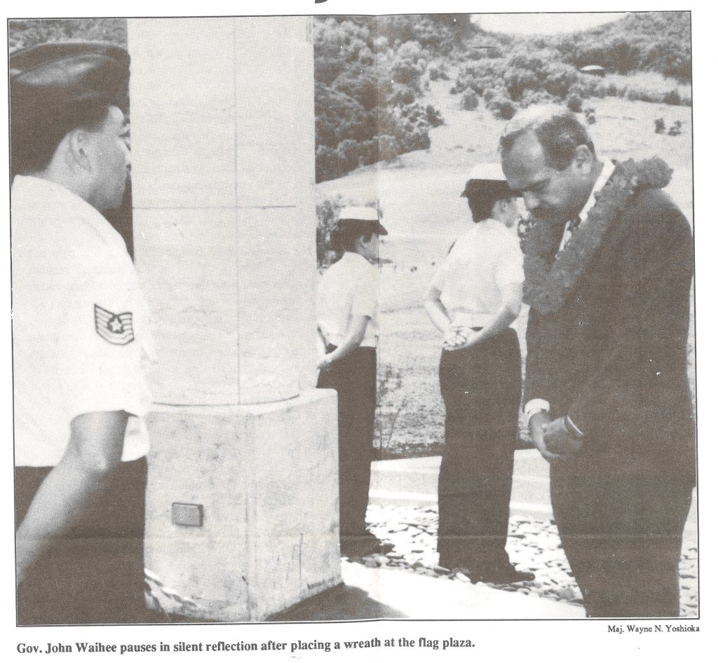 An atmosphere of reflection and prayer pervaded the midmorning ceremony dedicating the Hawaii State Veterans Cemetery (HSVC) in Kaneohe, July 2. Highlighting the ceremony was Gov. John Waihee’s keynote address and his presentation of a wreath to honor all Hawaii veterans. The governor’s presentation was followed by military honors, including a 21-gun salute, the playing of echo taps, and a missing-man flyover by Hawaii National Guard F-15 jet fighters.