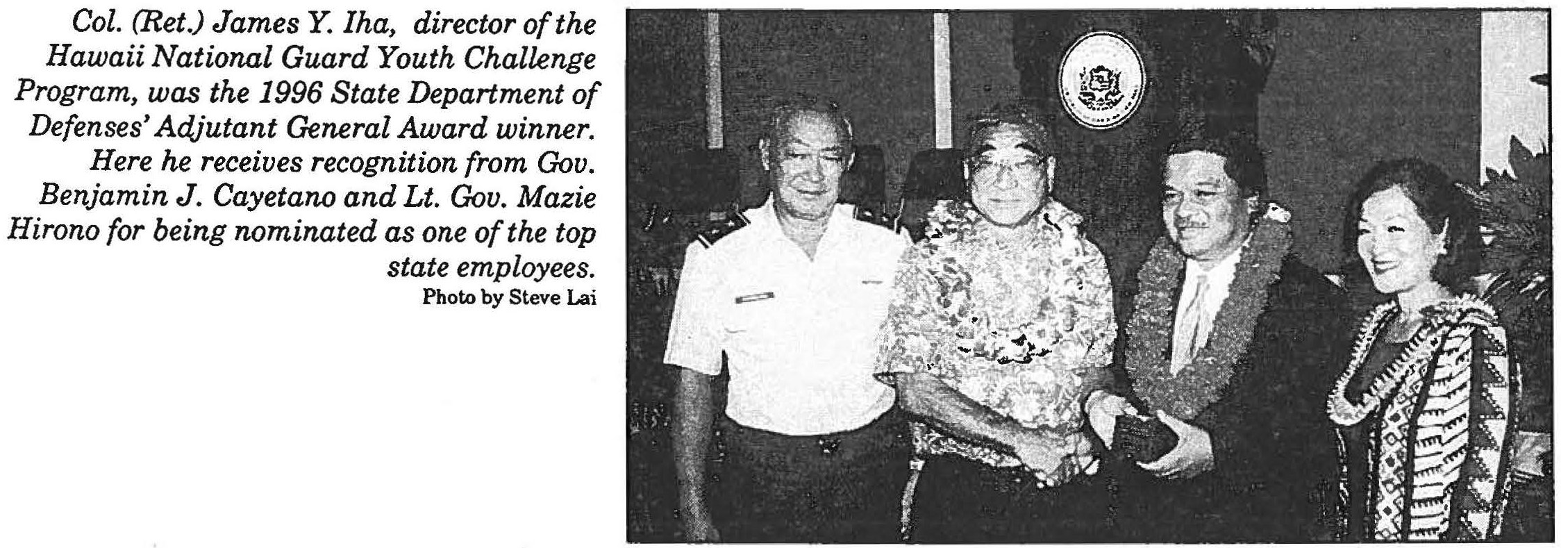 The 1996 recipient of the Adjutant General’s Award for Distinguished State Service was James Y. Tua, director of the Youth Challenge Program. The department’s nominee for the State Manager of the Year Award was Lt Col Edwin R Miyahira, Military Staff Officer, Operations and Training, in the Air National Guard Division.