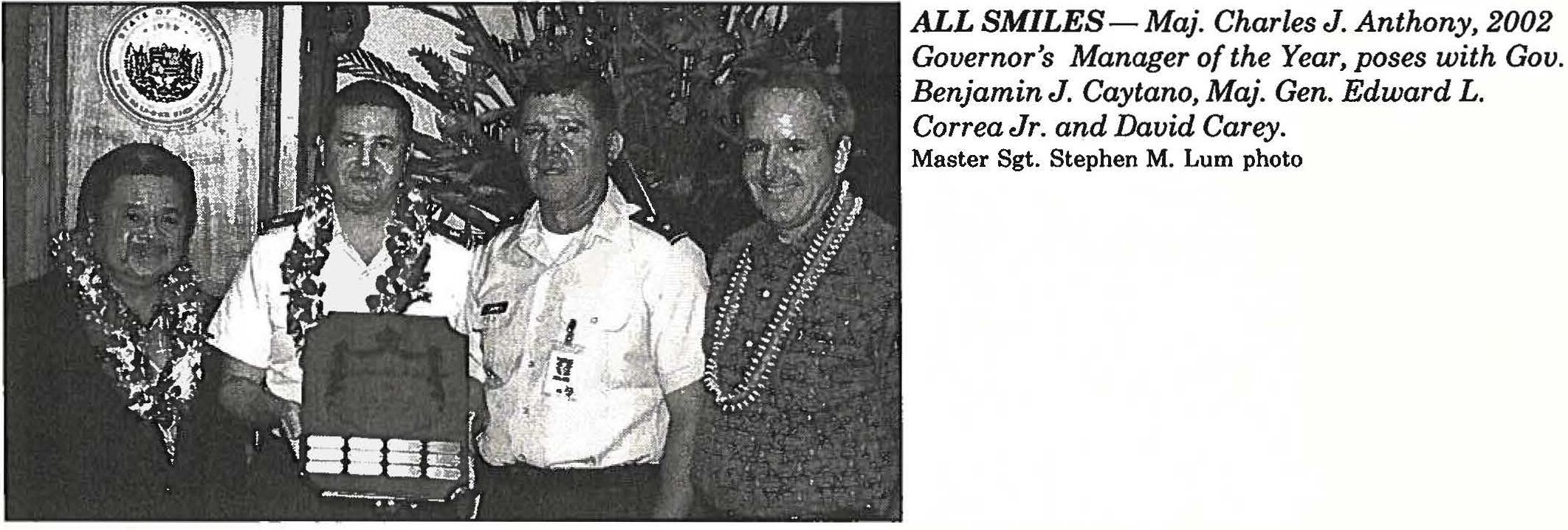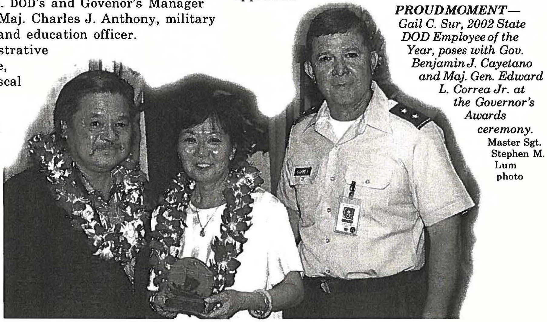 The 2002 recipient of the Adjutant General’s Award for Distinguished State Service is Gail C. Sur, an account clerk in the Administrative Services Office. DOD’s and Govenor’s Manager of the Year is Maj. Charles J. Anthony, military public affairs and education officer.