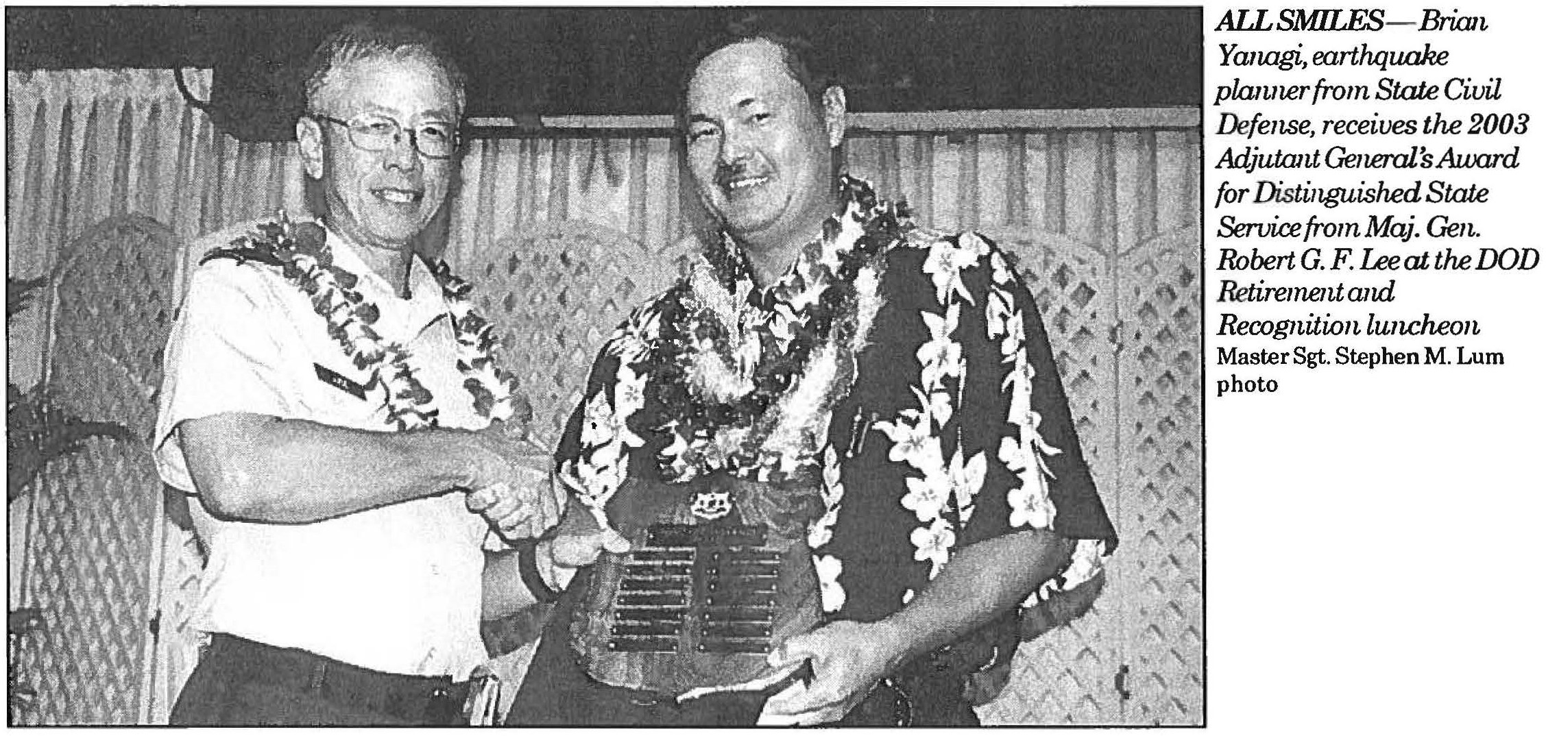 The 1993 recipient of the Adjutant General’s Award for Distinguished State Service was Roy S. Iwamoto, contracts assistant with the Engineering and Facilities Management Office. The departmental nominee for the state Manager of the Year Award for 1993 was Maj. Wayne N. Yoshioka, military public affairs and education officer with the Public Affairs Office.