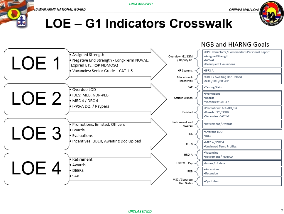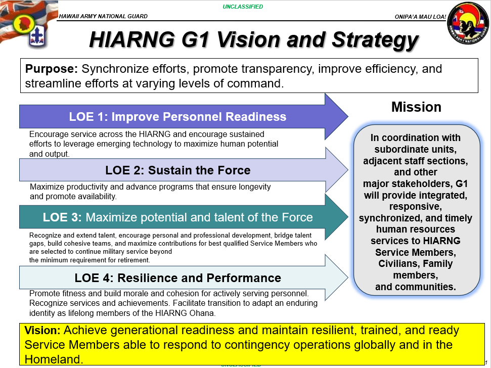 In coordination with subordinate units, adjacent staff sections, and other major stakeholders, G1 will provide integrated, responsive, synchronized, and timely human resources services to HIARNG Service Members, Civilians, Family members, and communities.