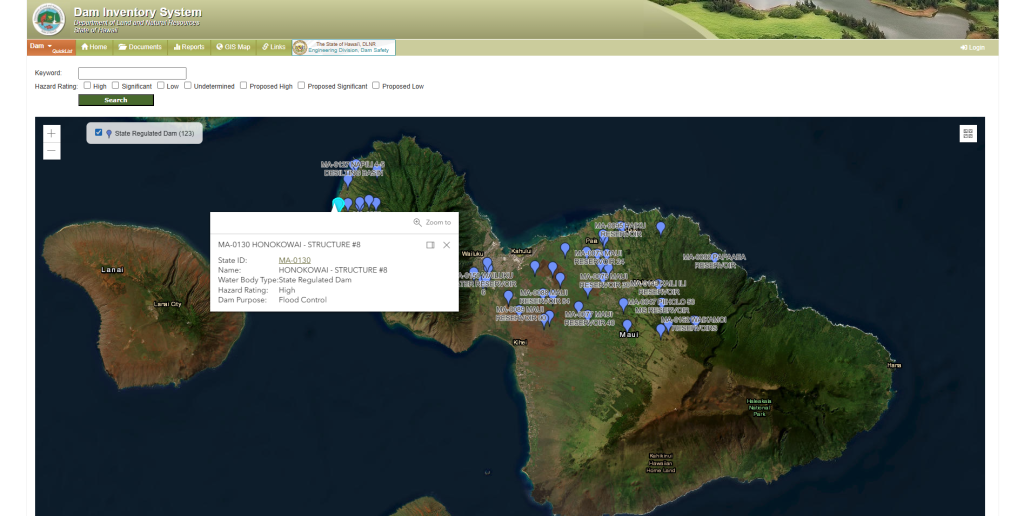 Information on state-regulated dams, including hazard level, condition, evacuation maps, inspection status and dam characteristics. For a description of hazard and condition classifications, you must also navigate here.