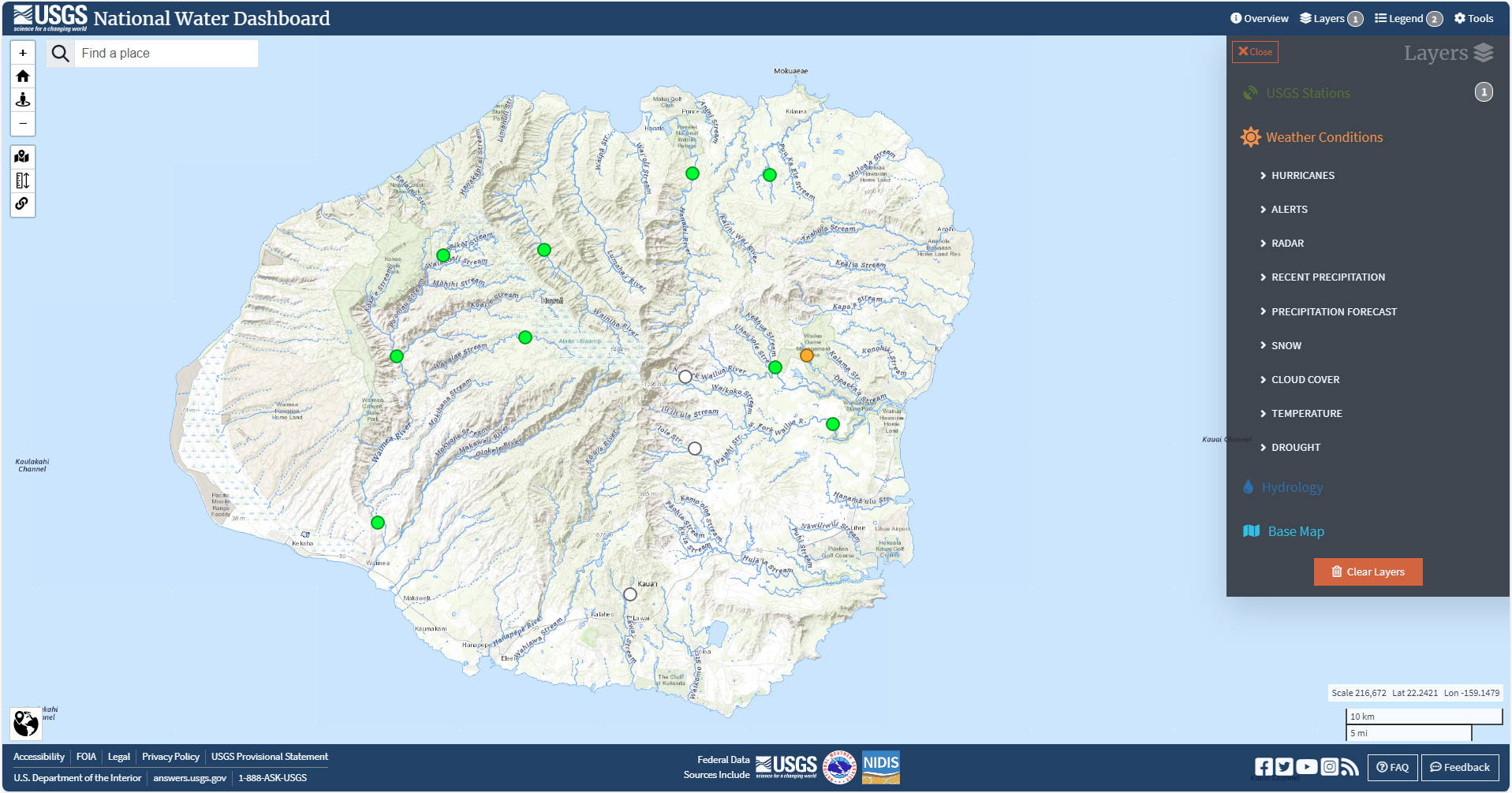 USGS map of streams, rivers and other waterbodies. Tools include stream flow monitors, water levels, and water quality; weather conditions including precipitation and radar; and base maps including satellite imagery, streets and topography.