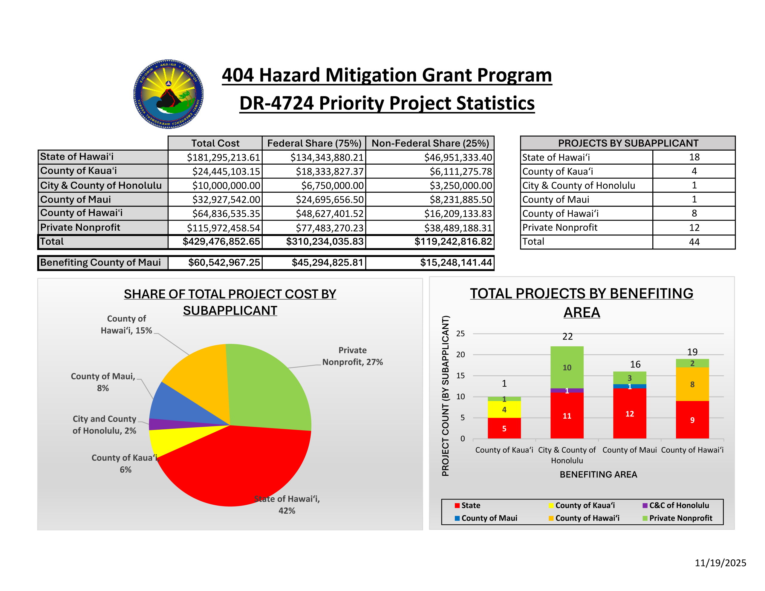 This posted list reflects the priority projects selected for the DR-4724 Hazard Mitigation Grant Program. Ranging from flood mitigation to hardening existing buildings against winds and other hazards, these projects, if approved, will benefit communities throughout Hawaiʻi by reducing risks during emergencies, improving emergency response and preparedness, and increasing community resilience.