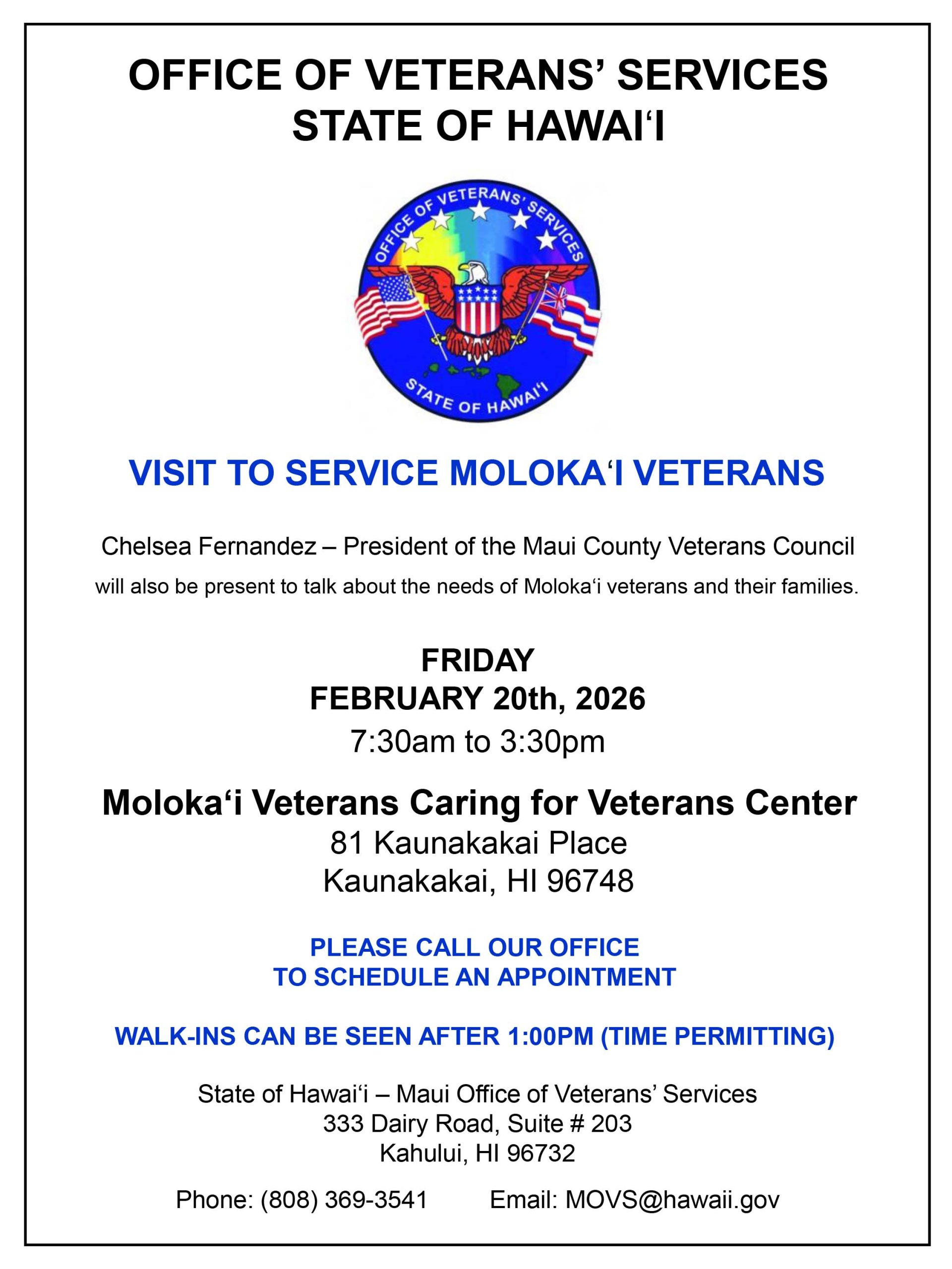 The Maui OVS office will be visiting Moloka’i on Friday, February 20th, 2026. Please call (808) 369-3541 or email [email protected] to schedule an appointment. Walk-Ins can be seen after 1pm (time permitting). Mrs. Chelsea Fernandez, President of the Maui County Veterans Council will be present to talk with you about veteran issues.