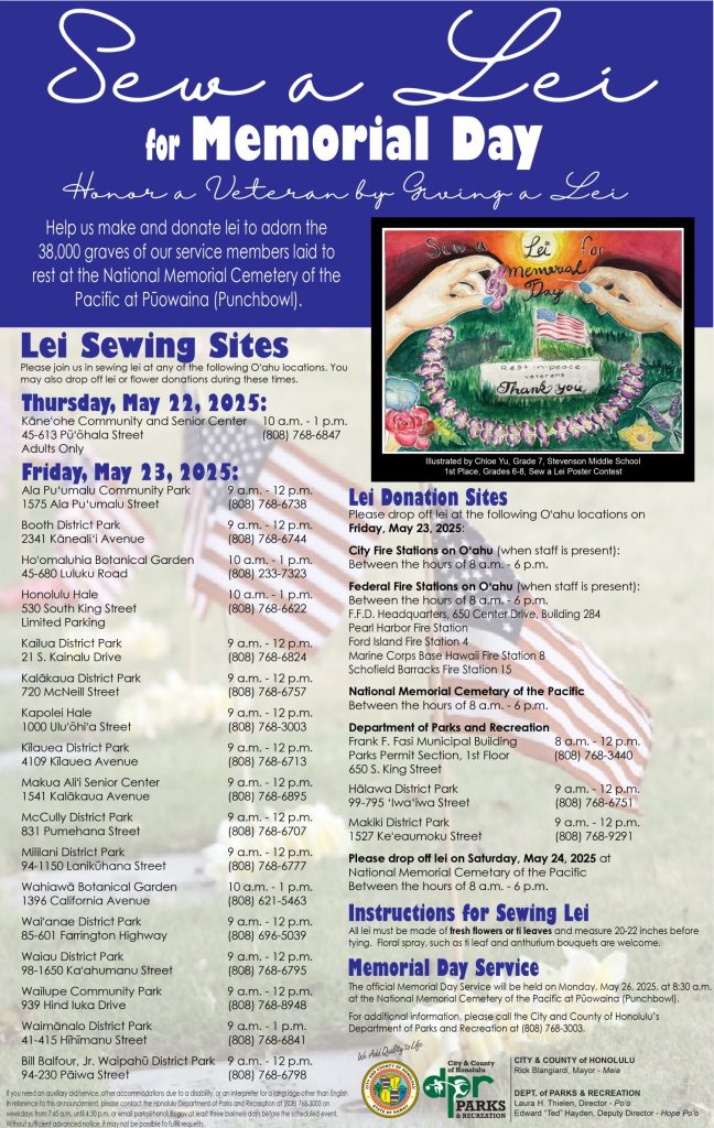 We have several lei-sewing opportunities at City locations around O‘ahu on Friday, May 23, 2025. If you can’t stay to make lei, you may also drop off lei or flower donations at these sites. Plumeria, crown flower, and ti leaves are preferred. Already made lei only need to be 10″-11″ when tied. A small kine effort can go a long way to help us “Sew a Lei for Memorial Day!”
