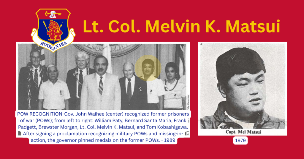 In 1974, Melvin Matsui started a new chapter by joining the Hawaiʻi Air National Guard, as a Weapon Systems Officer who flew with the 199th Fighter Squadron. He stayed in the Guard for the next 22 years, ultimately retiring as commander of the 169th Aircraft Control and Warning Squadron in 1996.